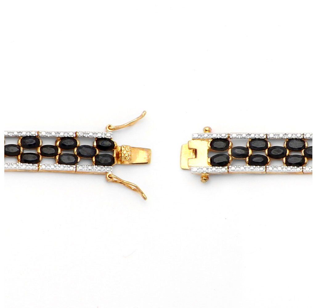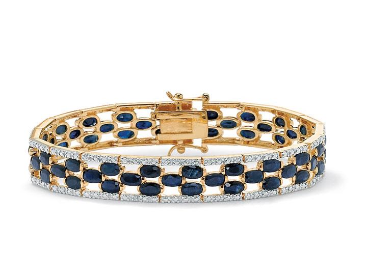 Radiant oval-cut midnight blue sapphire tennis bracelet shimmers with three rows of sparkle. Your tennis bracelet features 20.66 carats T.W. It takes on even more shimmer with a diamond accent creating a luxe look. It is 7.25" length and 14k gold-plated. (All carat weights are approximate and may vary slightly from those listed.)