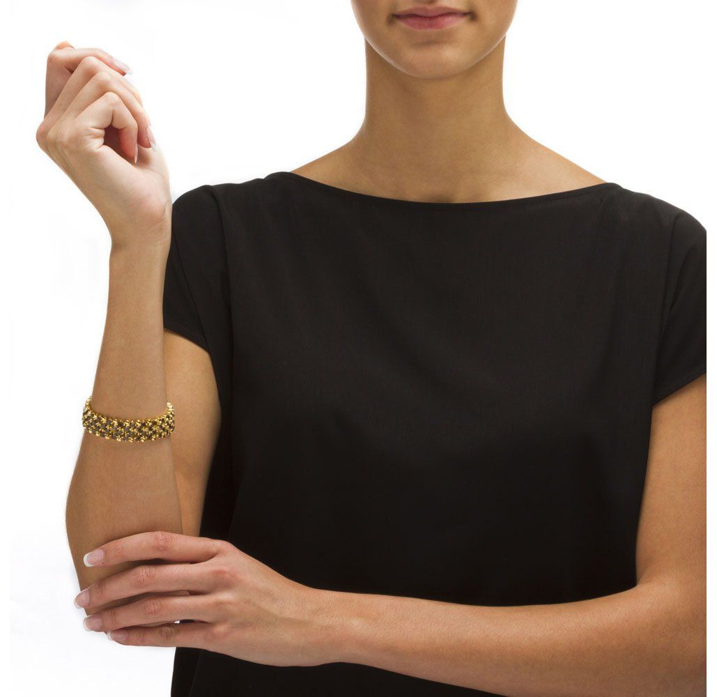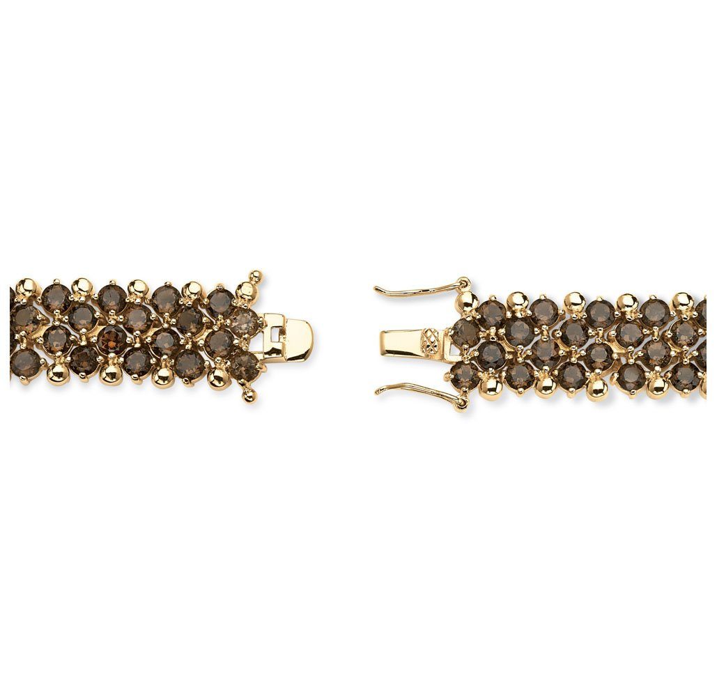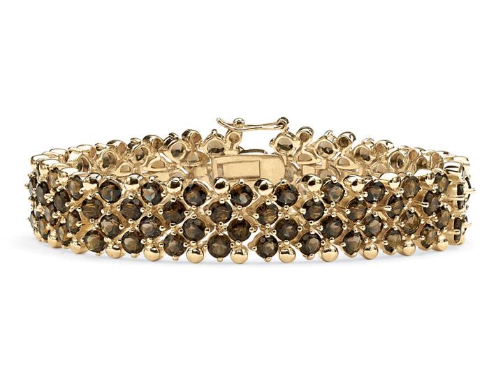 Smoky quartz adds a striking look to the traditional tennis bracelet. With one hundred round smoldering smoky quartz gemstones weighing 20 carats T.W., this beauty will easily become your favorite bracelet. Your bracelet is 7.25" in length and is 14k gold-plated.