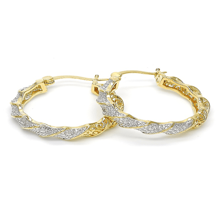 Fabulous twisted 2-tone hoop earrings encrusted with sparkling diamonds is up for grab. Timeless and exuding with elegance, this piece of jewelry will totally complete your ensemble. Can be worn and paired with casual and formal wear. A must in your jewelry collection. This design will never go out of style.