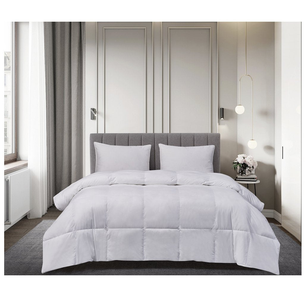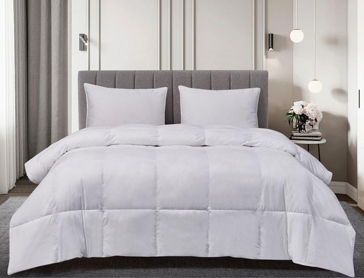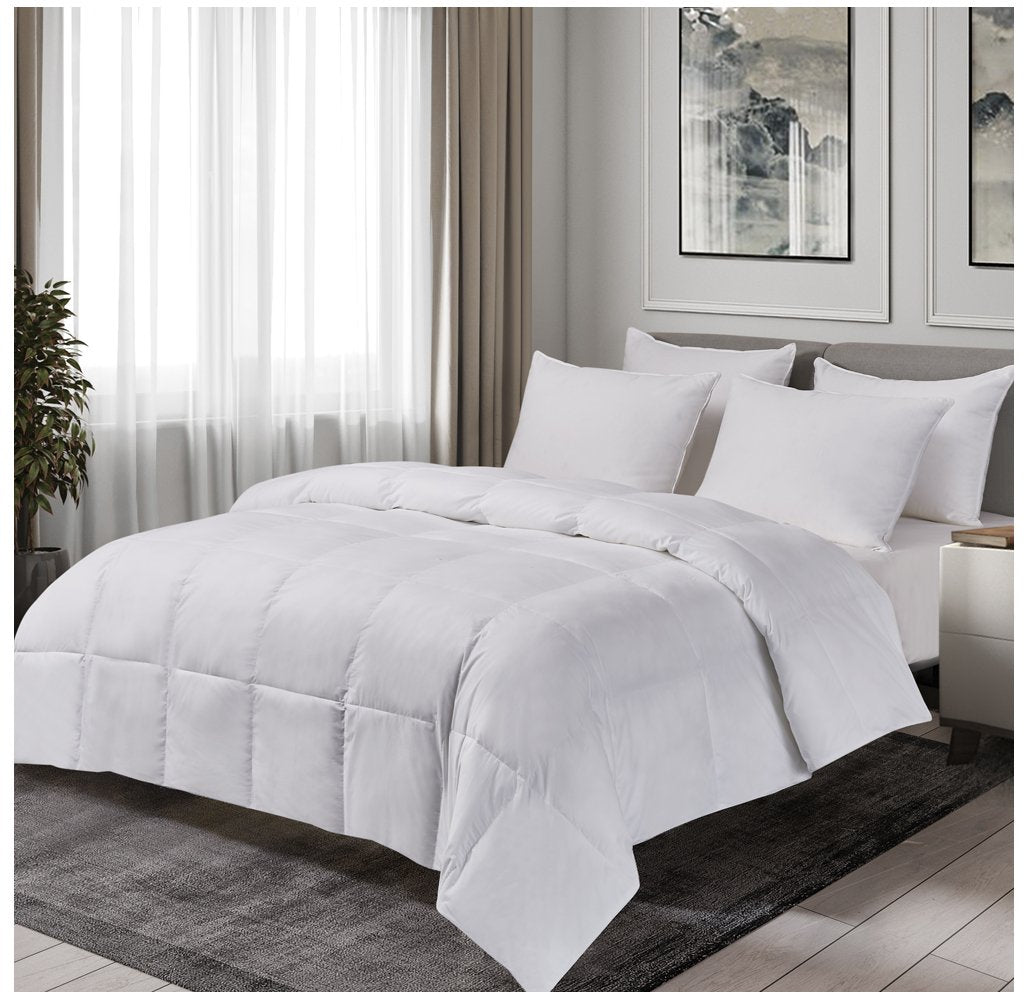 Slumber in luxury snuggled under your all-season white goose down and white goose feather comforter. Filled with 25-percent white goose down and 75-percent white goose down feathers, the comforter provides cozy warmth. It is a 240-thread-count cotton cover with end-to-end box construction provides durability and keeps the white goose down and white goose feather fill from shifting for lasting comfort.