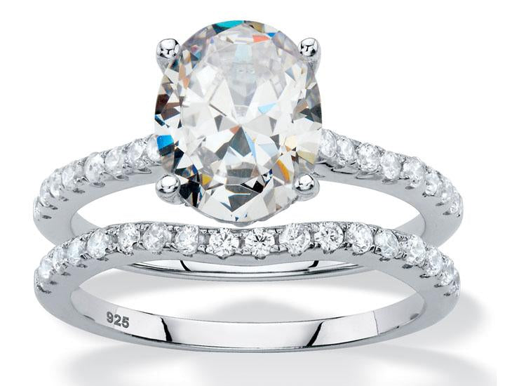 With the timeless style of a solitaire, your elegant 2-piece bridal ring set features a large oval-cut center cubic zirconia stone atop a slender band of small cz rounds to catch the light from every angle. A matching wedding band finishes the sparkling look for the ultimate in true bridal style. 3.14 carats T.W. Set in platinum over sterling silver. Sizes 6-10.