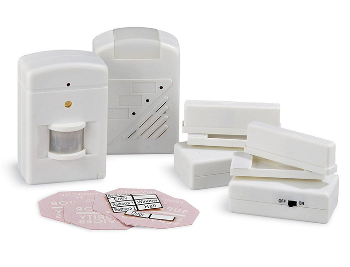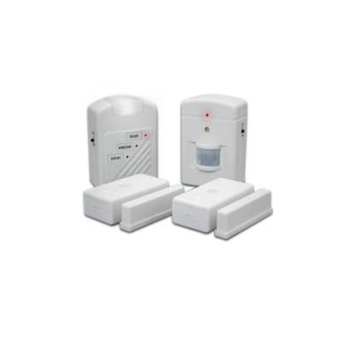 This 3-Station Home Alarm System monitors 3 areas at once, individual alarms sound when tripped. Base station sounds alarm and lights up while LEDs indicate location. Includes a motion sensor, 2 door and window sensors, a base station, and 4 security service window stickers.