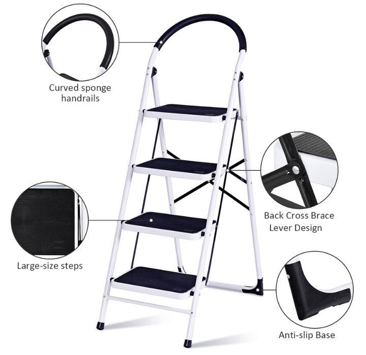 This 4-Step 330 lb Capacity Folding Ladder is perfect for any task around house, office, or garage. Whether it is reaching a high cabinet, changing the light bulb, or washing the windows, the 4-step ladder makes it easier to get any job done! Because the ladder is lightweight and folds, it's very easy to store and transport.