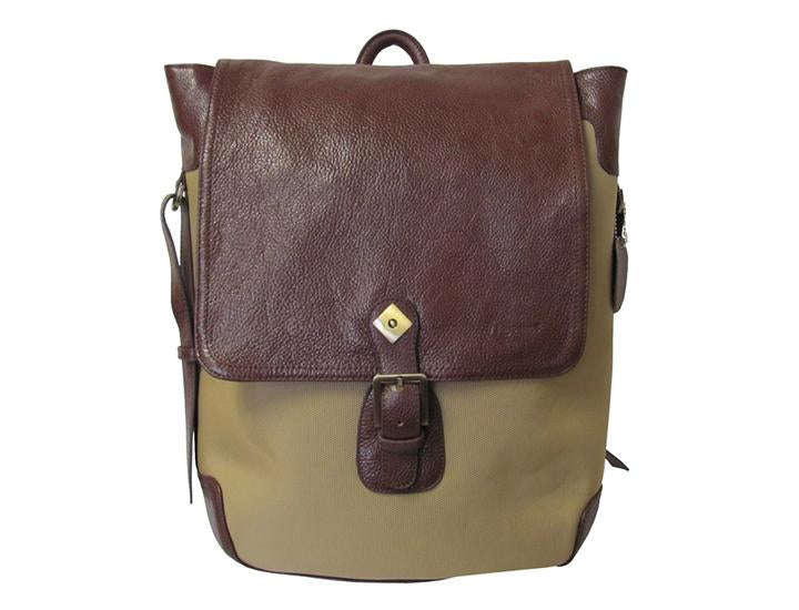 This genuine top-grain leather/ballistic nylon backpack offers great versatility. It features belt straps on the side and a single magnetic snap flap closure. The sturdy rolled leather handle lets you transport the bag without using the back straps. A fully lined large compartment for storing books or documents comes with attractive and durable zipper and hardware.