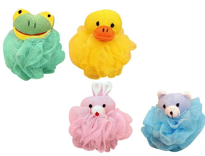 Your fun and festive animal themed bath and shower poufs feature soft yet durable netting perfect for creating luxurious lather and suds with your favorite soap or shower gel. Designed with a convenient ribbon handle to hang dry for daily use. Safe for even the most sensitive baby skin. Includes Bear, Bunny, Frog and Duck.