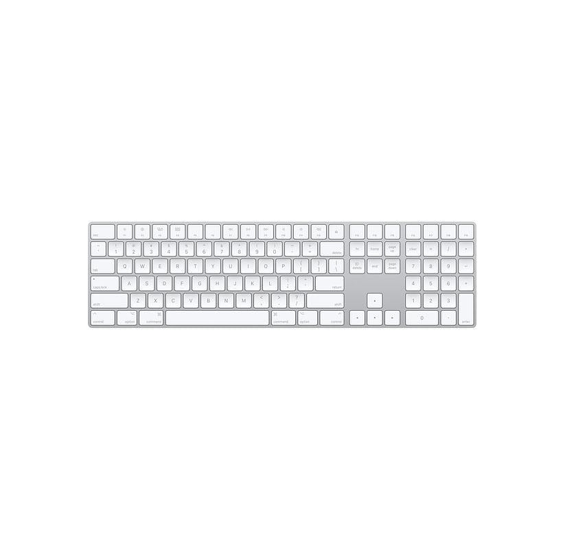 Magic Keyboard with Numeric Keypad features an extended layout, with document navigation controls for quick scrolling and full-size arrow keys for gaming. A scissor mechanism beneath each key allows for increased stability, while optimized key travel and a low profile provide a comfortable and precise typing experience. The numeric keypad is also great for spreadsheets and finance applications. The built-in, rechargeable battery is incredibly long-lasting, powering your keyboard for about a month or more between charges.