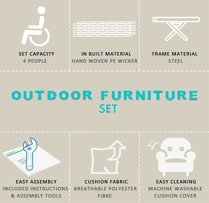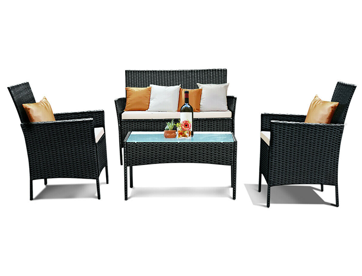 Our new rattan wicker furniture set includes 1 loveseat, 2 chairs and 1 coffee table with glass top. This furniture set will light your outdoor living space and make it standout for its modern and upscale design. Made of eco-friendly rattan material and sturdy steel frame, this furniture will serve its purpose for a long time. Matched seat cushions come with it to add comfort for the seat. Coffee table with a glass top, which will be level to hold your drinks.