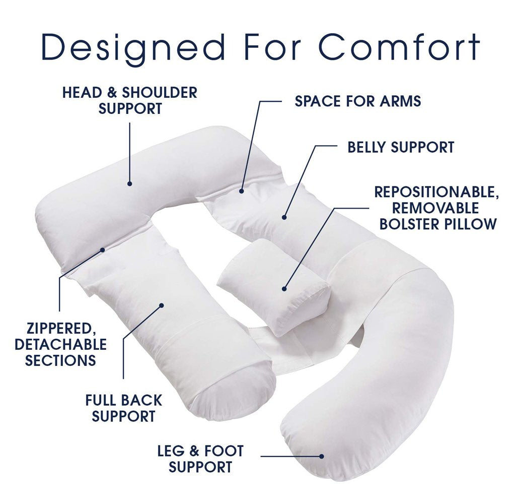 Your pregnancy pillow is fully adjustable to your body for the ultimate comfort during pregnancy and beyond. With supple support that cradles your body, it eliminates the need for several pillows, and eliminates the annoying sensation of having pillows shift out of place during sleep. The back and belly portions of the pillow are zippered and can be removed, so you choose the level and position of your support.
